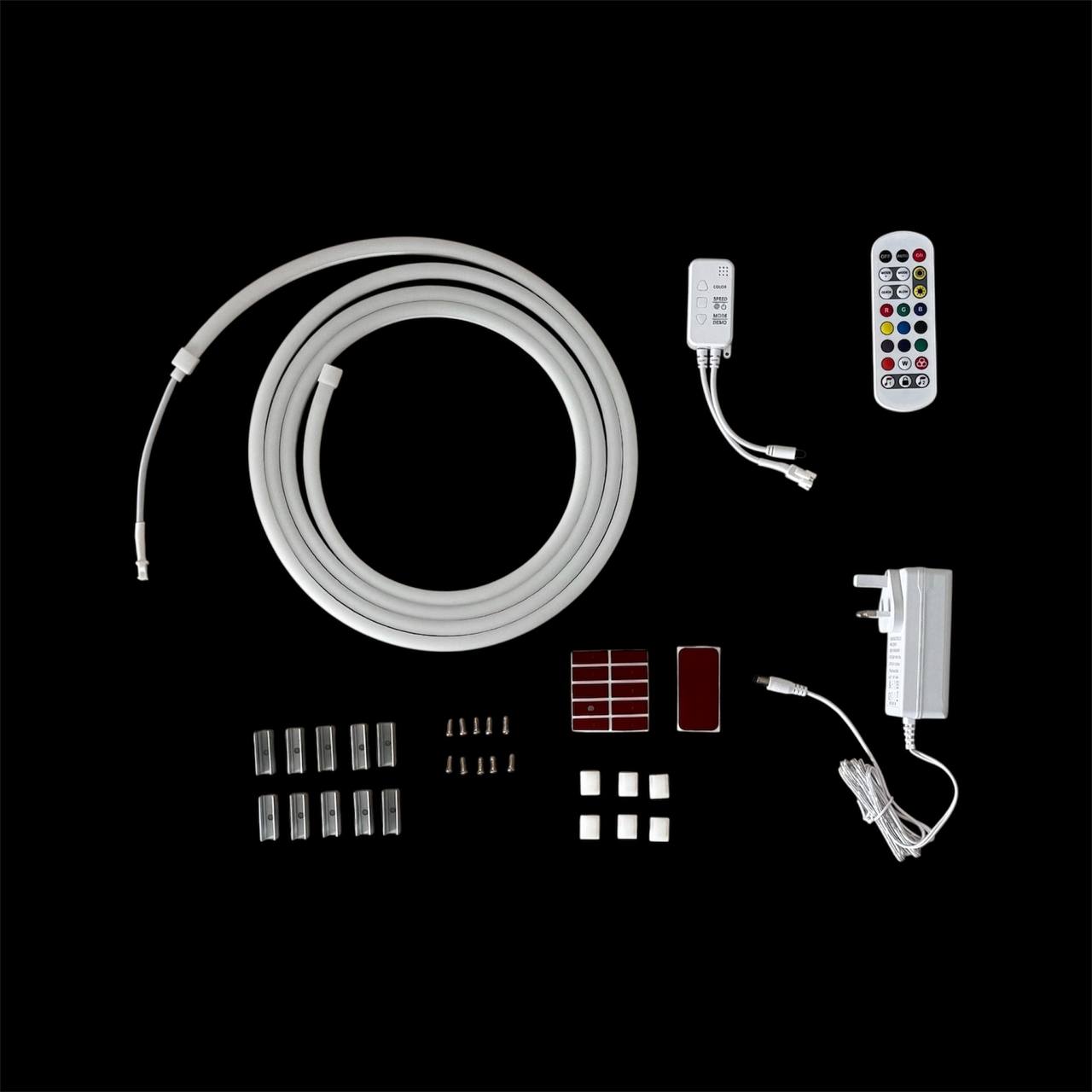 - محتويات العلبة: شريط إضاءة، جهاز تشغيل، ريموت، كتيب التعليمات، قابس جداري ثلاثي.